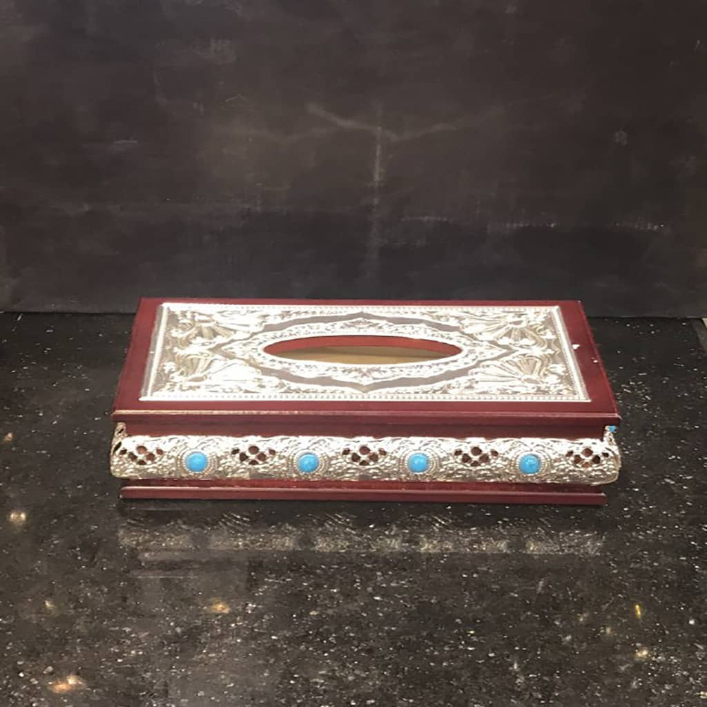A metal and wood tissue box